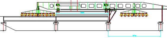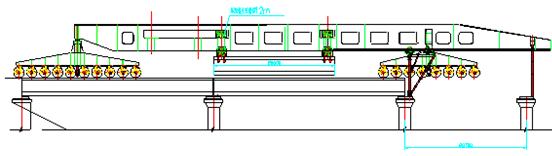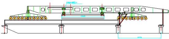 架橋機架完32米梁后,接著架設(shè)24米梁時,拆除主梁后起重小車縱移范圍滑道內(nèi)的支撐架,通過縱移油缸和導(dǎo)桿裝置以倒頂?shù)姆绞綄⒑笃鹬匦≤嚽耙?m,恢復(fù)主梁內(nèi)支撐架,其余架梁作業(yè)程序相同。其它跨度的變跨方式同上。不同跨度的支撐架位置及后起重小車位置示意如下。